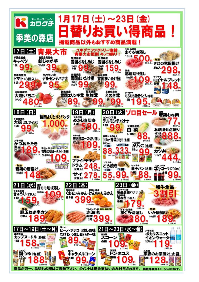 量産型ブログ HOME > チラシ > チラシ スーパーチェーンカワグチ 季美の森店の最新チラシ【2026年1月17日(土)~23日(金)】 2024年7月21日 2026年1月19日 スーパーチェーンカワグチ 季美の森店の『最新のチラシ』
