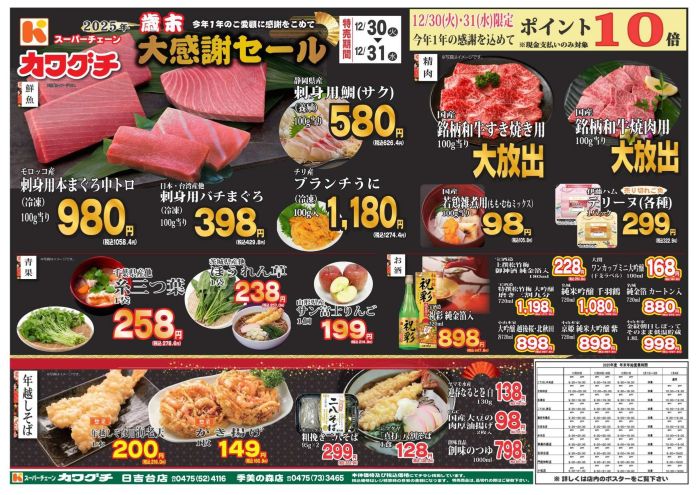 量産型ブログ HOME > チラシ > チラシ スーパーチェーンカワグチ 季美の森店の最新チラシ【2025年12月28日(日)~31日(水)】 2024年7月21日 2025年12月30日 スーパーチェーンカワグチ 季美の森店の『最新のチラシ』