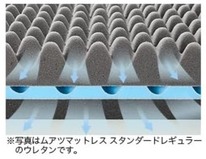 ムアツは「ウレタンフォーム」、エアウィーヴは「エアファイバー」(ポリエチレン樹脂)というまったく異なる素材を使用しています。
